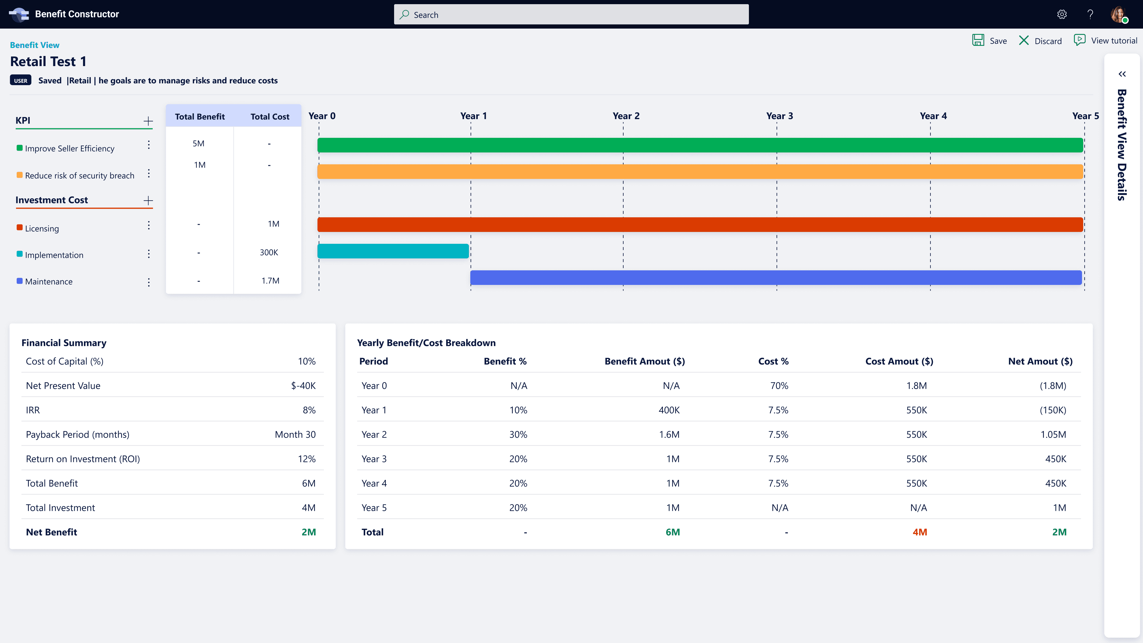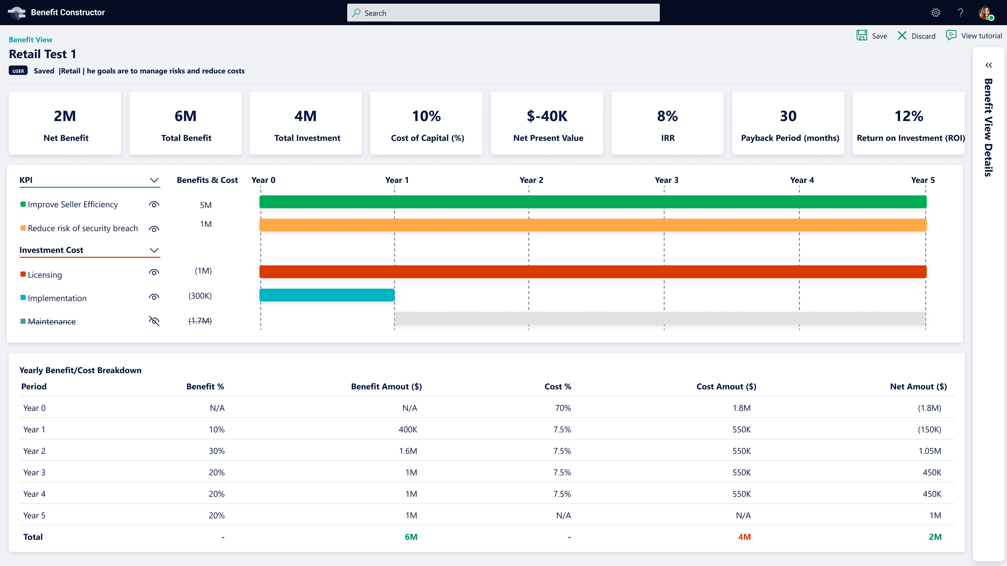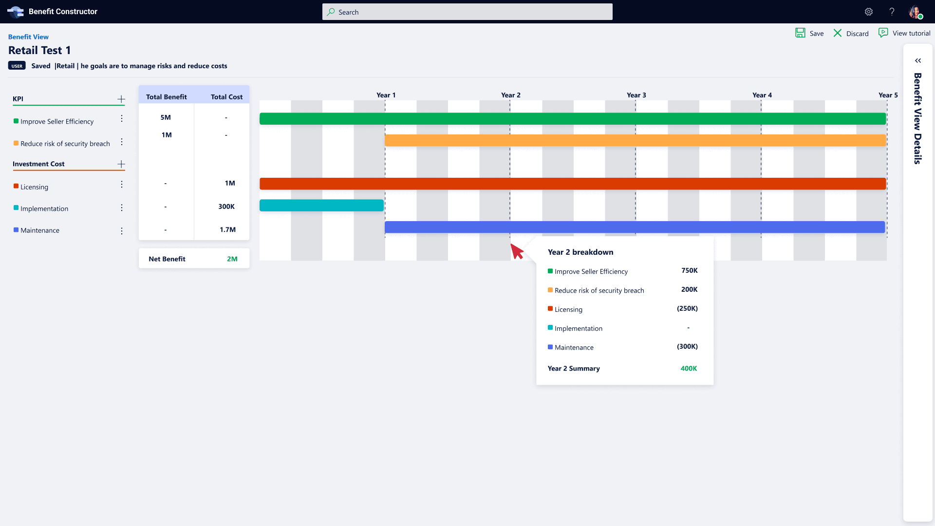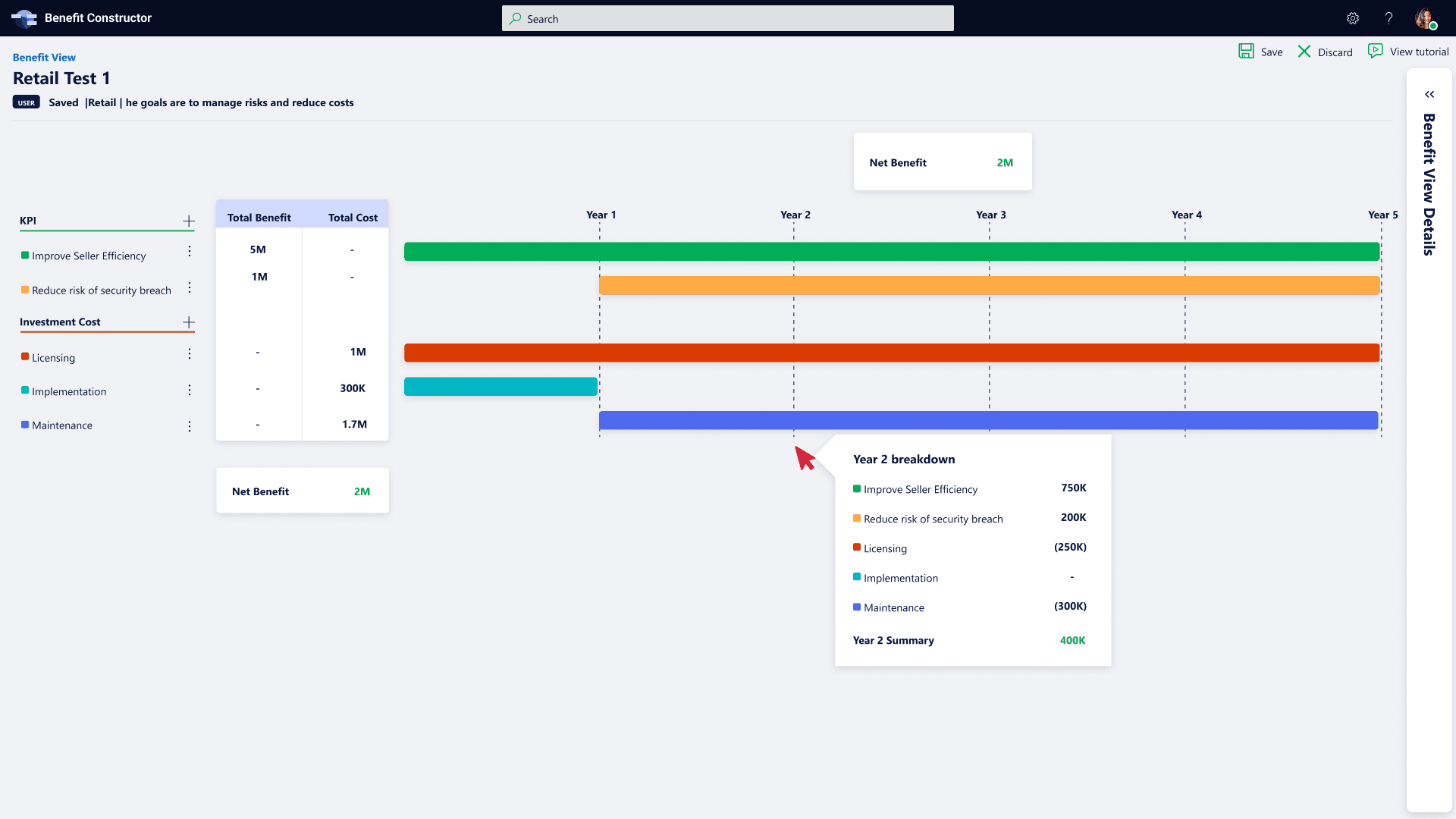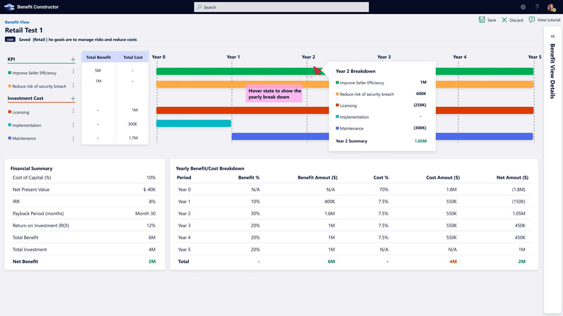 The key metrics in determining the main visual were to show the cost and benefit progression over time. One of the leading solutions was a simple line graph in the team brainstorming session. However, stakeholders wanted future expansion in mind for adding different functionalities such as changing the total length of a benefit using the visual. Hence, the team determined a Gantt chart that ensures familiarity for users and expandability for future sprints.
